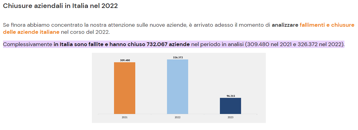 Nel 2021 sono fallite 309.480 aziende, e nel 2022 siamo arrivati a 326.372 chiusure totali.
